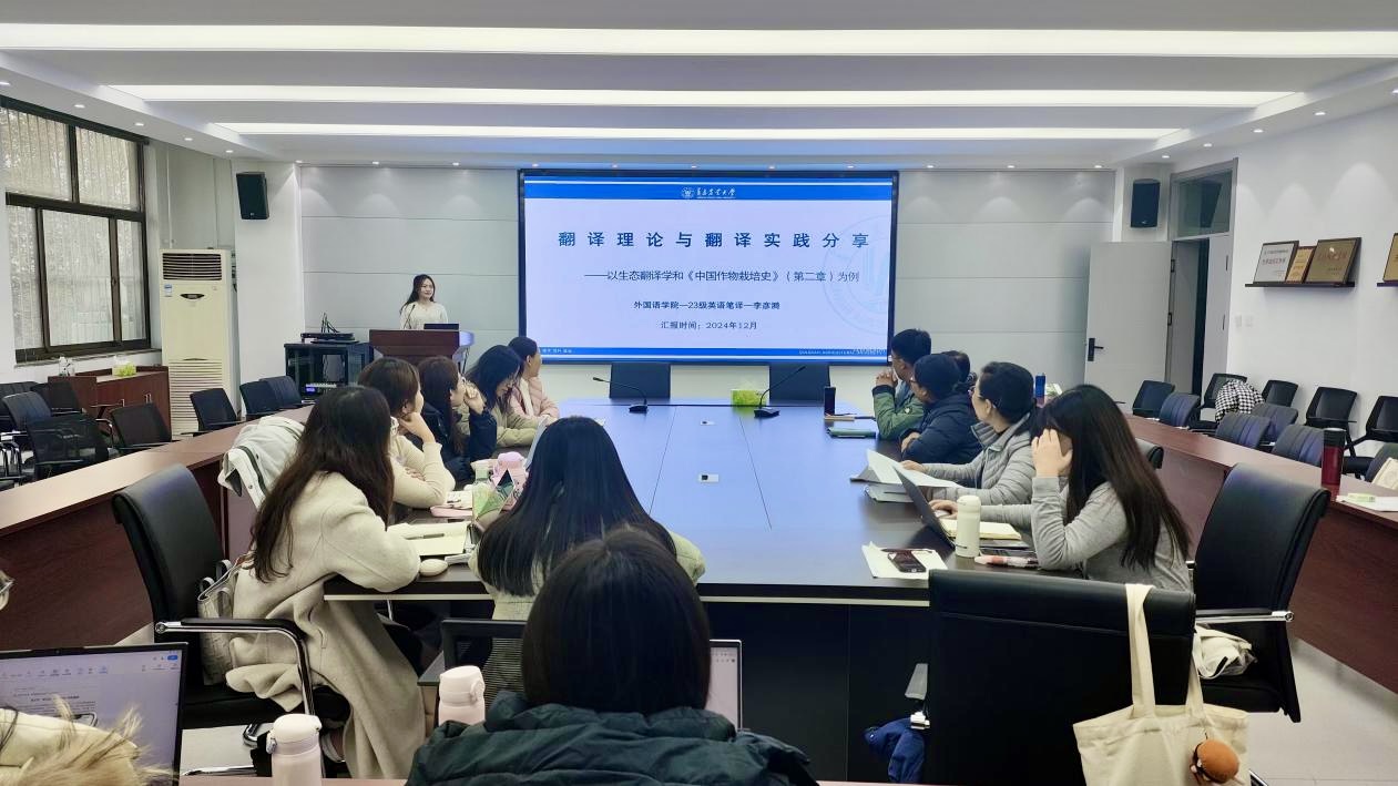 会上,2023级研究生王维平、李申、李彦漪、刘玉琪、臧俊捷、高俊洁等6名同学依次介绍了自己的研究课题,汇报自己在研究和实践中取得的成果。报告内容涉及中国古代农业术语翻译、农业文本翻译的难点及对策、中国饮食文化中地方性知识的翻译转化等多个主题。点评环节,导师们对同学们的研究和实践成果给予了肯定,也指出了她们研究中的不足之处,并提出了有建设性的意见和建议。