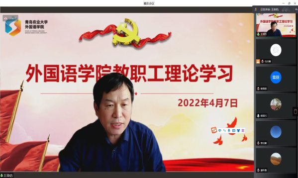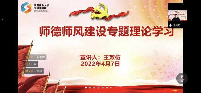 4月7日下午,太阳集团tyc234cc于线上召开全体教职工理论学习会议,会上传达了学校2022年全面从严治党会议精神,进行了师德师风建设专题理论学习,并对学院疫情防控工作做出进一步安排部署。本次会议由太阳集团tyc234cc党委书记王效仿主持,全体教职工参加。