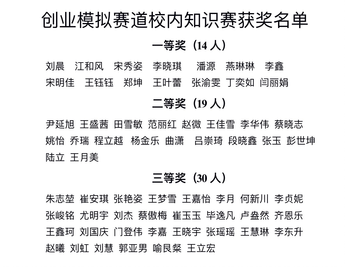 此次竞赛经过知识赛、校内选拔赛及山东省总决赛预选赛后,大赛组委会通过组织线上创业软件模拟竞赛,根据各参赛团队成绩,评选出山东省总决赛本科组(含研究生组)一等奖138项、二等奖183项和三等奖136项。我校获得一等奖的3支队伍晋级全国总决赛。我校知识赛于4月13日进行,共计143名同学参加了线上知识赛答题。14名同学获得校赛一等奖,19名同学获得二等奖,30名同学获得三等奖。在平台模拟校内选拔赛阶段,27支团队参加了比赛,根据平台软件竞赛得分优选出10支队伍角逐山东省总决赛。