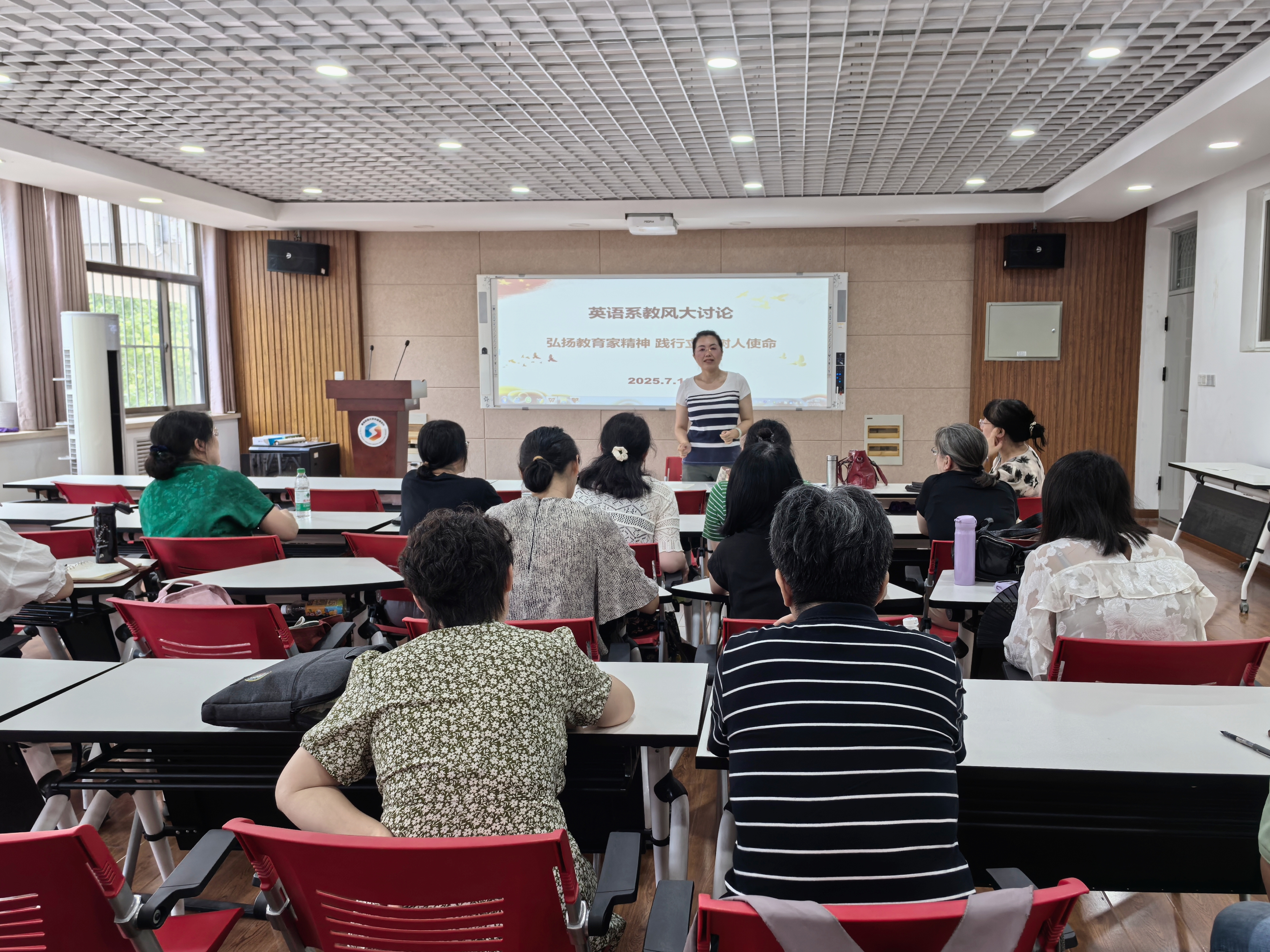 太阳集团tyc234cc英语系于2025年7月10日召开教风建设专题研讨会,展开教风大讨论,会议以“弘扬教育家精神,践行立德树人使命”为主题,聚焦教风建设、规范落实与教学创新,老师们一起学习了习近平总书记关于“四有好老师”的重要讲话和《中共中央 国务院关于弘扬教育家精神加强新时代高素质专业化教师队伍建设的意见》等文件。结合英语学科特色,深入探讨了如何将师德师风融入跨文化沟通、语言实践等教学场景,通过优良教风涵养良好学风,树立胸怀天下、以文化人的追求,涵养启智润心、因材施教的育人智慧,不断提升育人能力与水平。