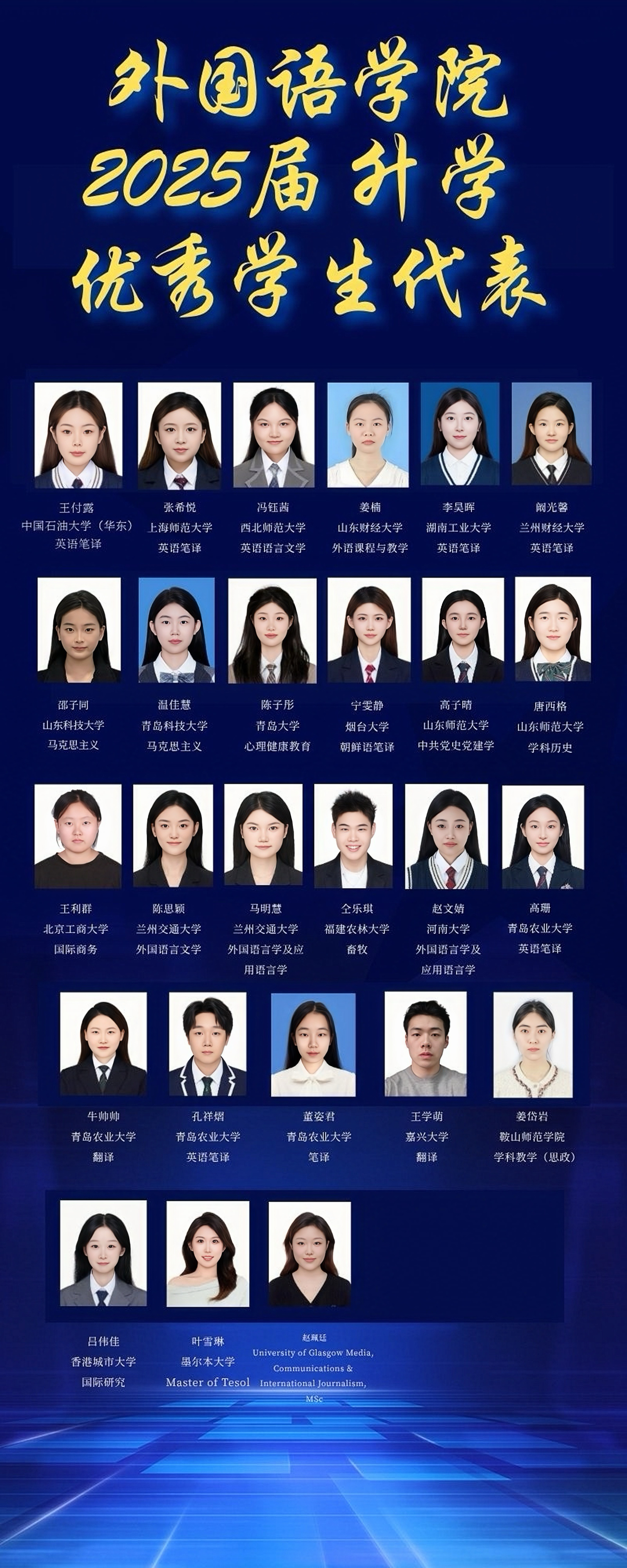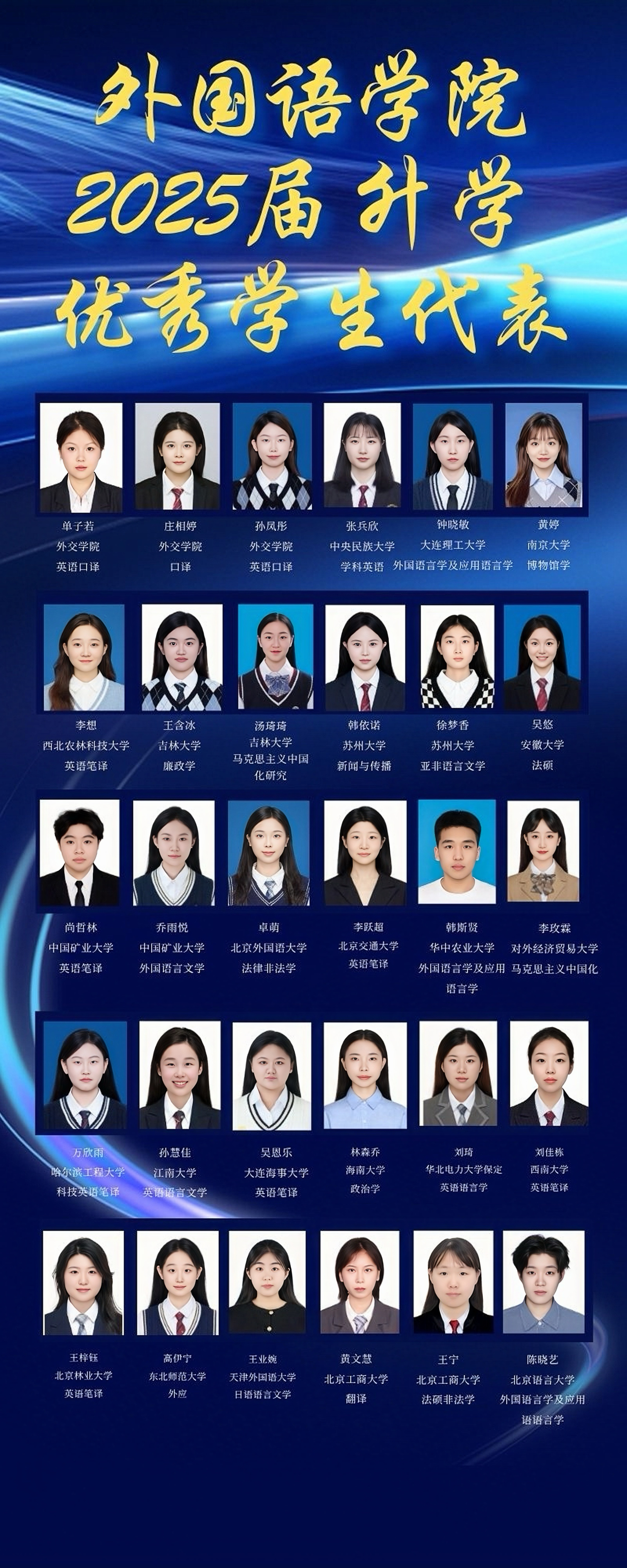 在全院老师精心指导和同学们不懈努力下,经过升学动员会、升学经验交流与分享会、考研复试指导讲座和模拟面试等系列工作,截至目前,太阳集团tyc234cc2025届毕业生共76人成功考取研究生或出国深造,升学率达24.13%。其中,多名同学被外交学院、北京外国语大学、南京大学、吉林大学和爱丁堡大学等知名高校录取。2025届升学光荣榜已经出炉,请全体同学以榜样为力量,勇攀高峰,成就辉煌!