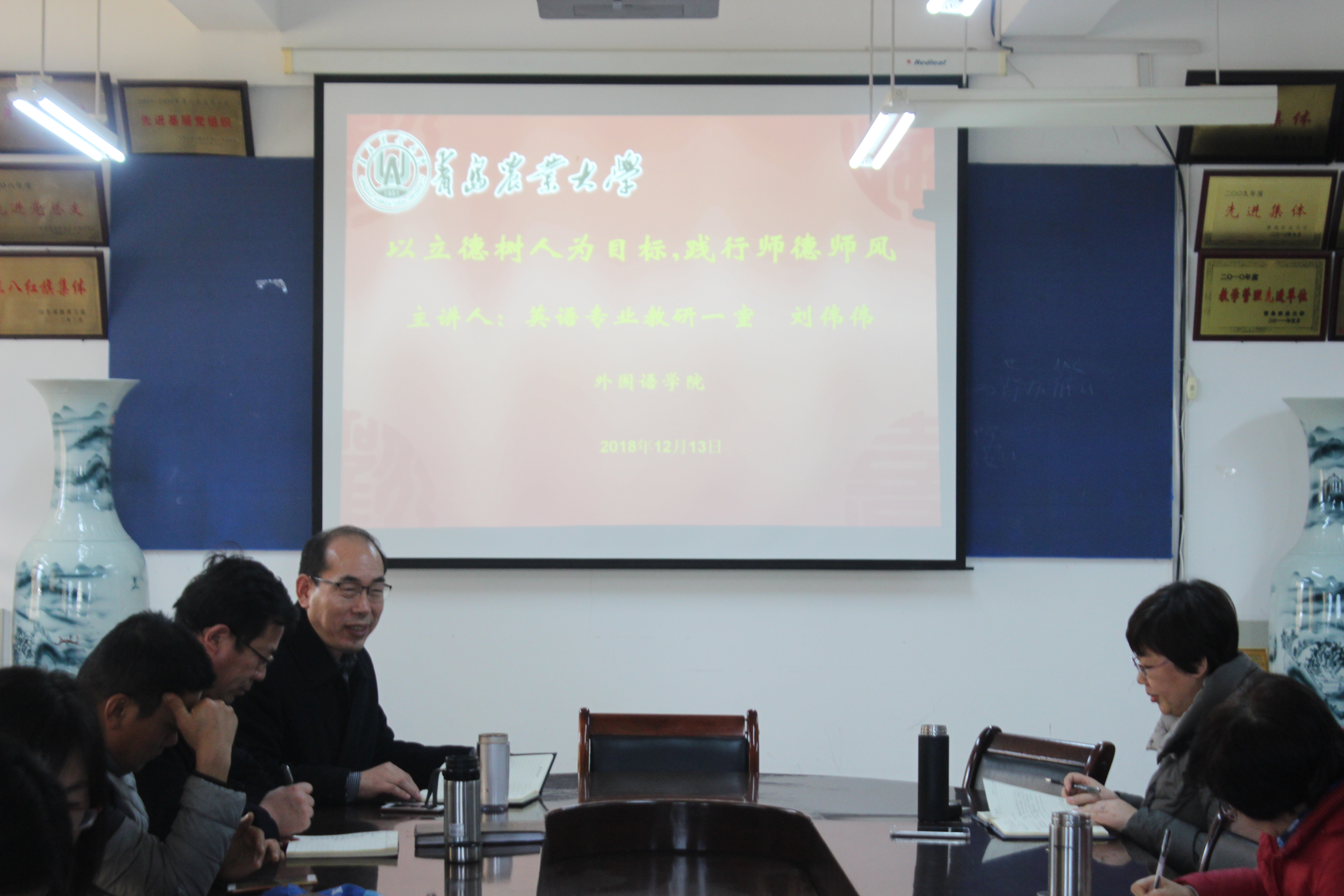 朝鲜语教研室教师金艳花、英语专业教研一室教师刘伟伟分别以“师德师风与教书育人”和“以立德树人为目标,践行师德师风”为主题作了交流发言。金艳花在发言中表达了自己对师德的理解,指出教师要以立德树人为己任,把教书与育人统一起来,既要对学生传授知识技能,又要在思想上教育引导。她结合自己的教学经验谈到:上好课,首先要了解学生;教外语,要在教学中讲文化礼节。刘伟伟结合习近平总书记关于立德树人的重要论述,谈到教师要树立良好的师德师风,应从四个方面做起:一是以身作则,以德施教;二是爱岗敬业,乐于奉献;三是提升教师自我修养;四是在教育教学实践中不断反思。