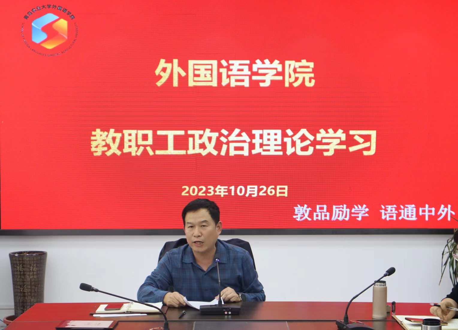 廉政谈话结束后,盛金玉领学了《理论学习参考·习近平文化思想专题(2023年第14期)》中的《深入学习领会习近平文化思想》,学院全体教职工集体观看了新闻联播部分内容《习近平对宣传思想文化工作做出重要指示》。