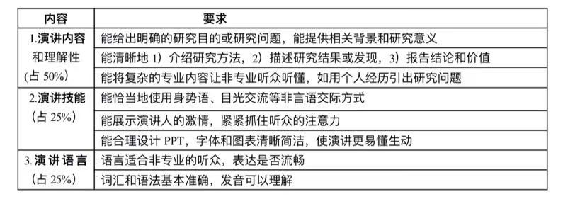 2.英语演讲视频。演讲作品基于用英语撰写的研究报告或研究计划。要求团队推选一名成员用易于理解的英语,在5分钟内向没有专业背景的听众介绍自己的研究。演讲要求录制成5分钟视频(误差不超过1分钟)。评分标准见表1。