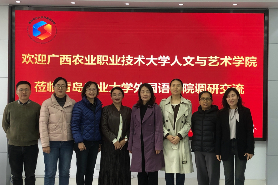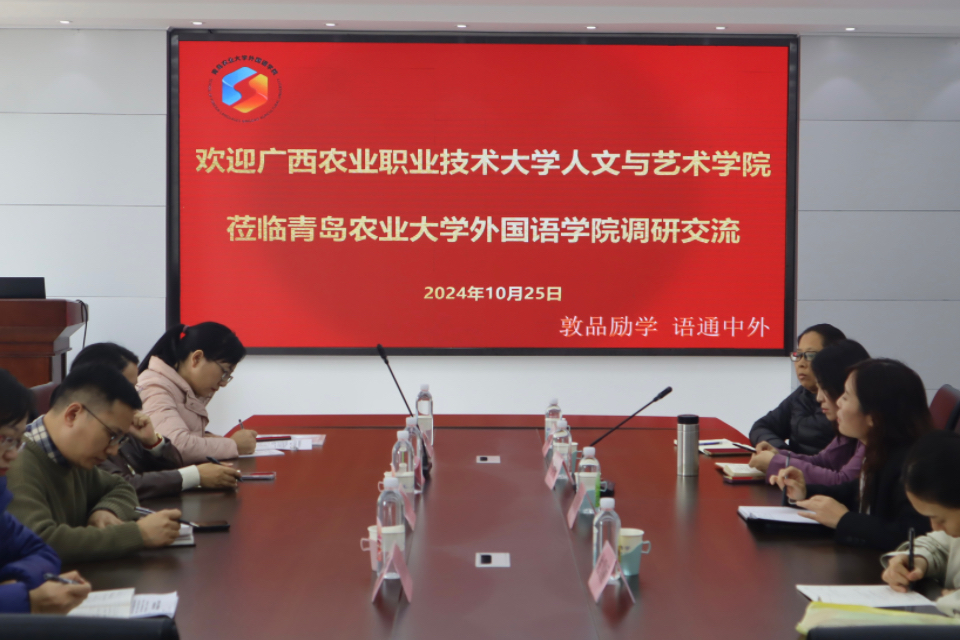 10月25日,广西农业职业技术大学人文与艺术学院副院长宁静一行四人到访我校太阳集团tyc234cc,就一流课程建设、课程思政建设、教材建设、师资队伍提升、品牌建设以及英语专业校企合作、产教融合等工作进行调研交流。太阳集团tyc234cc李春梅副院长、大学英语教学部主任聂庆娟、王珍以及英语系副主任姚雪丽参加。