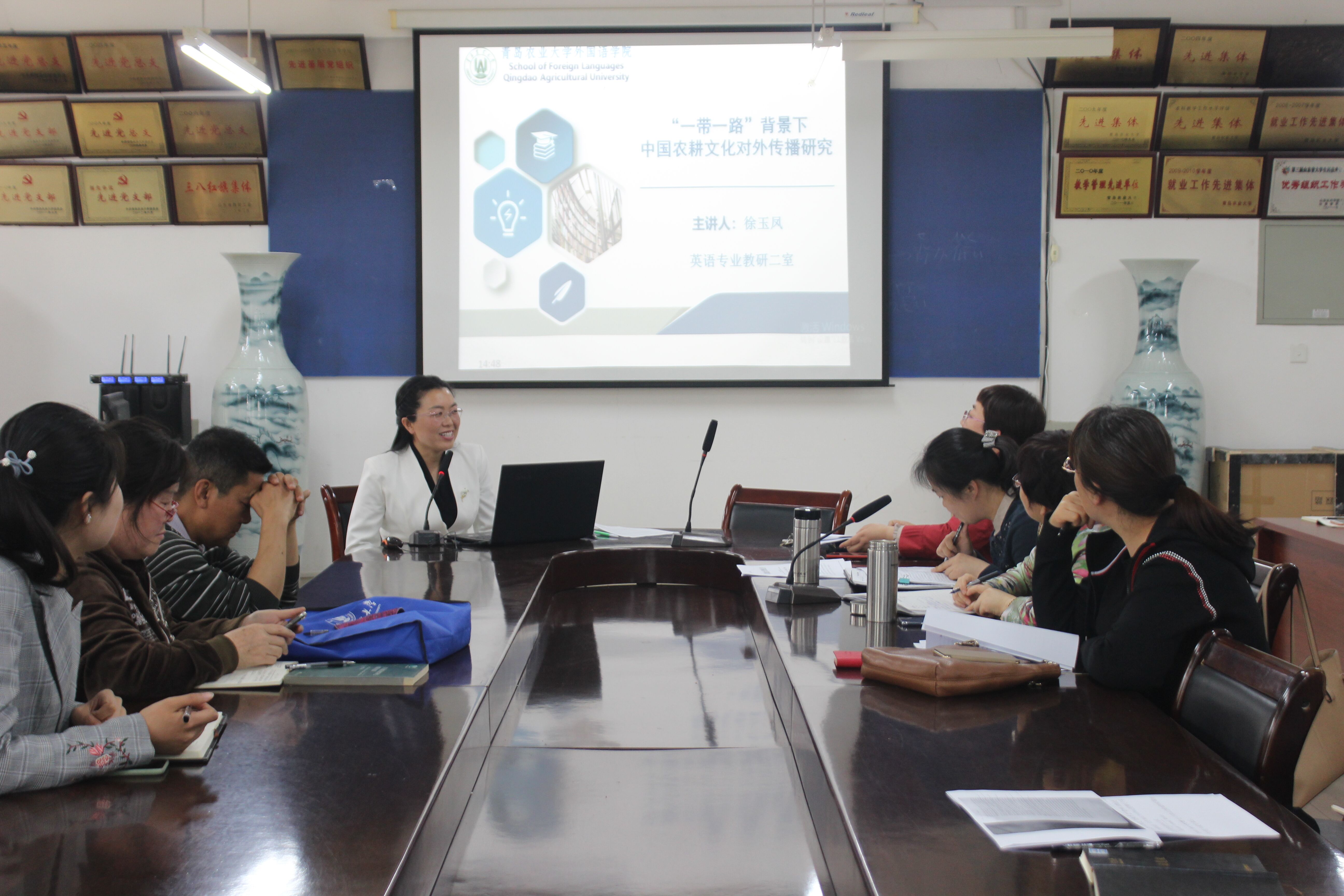 5月9日,太阳集团tyc234cc于文经楼会议室开展外语学术论坛第三讲。此次学术论坛由徐玉凤博士主讲,主讲题目为《“一带一路”背景下中国农耕文化对外传播研究》,学院全体领导、教职工与会,副院长高秀雪主持论坛。