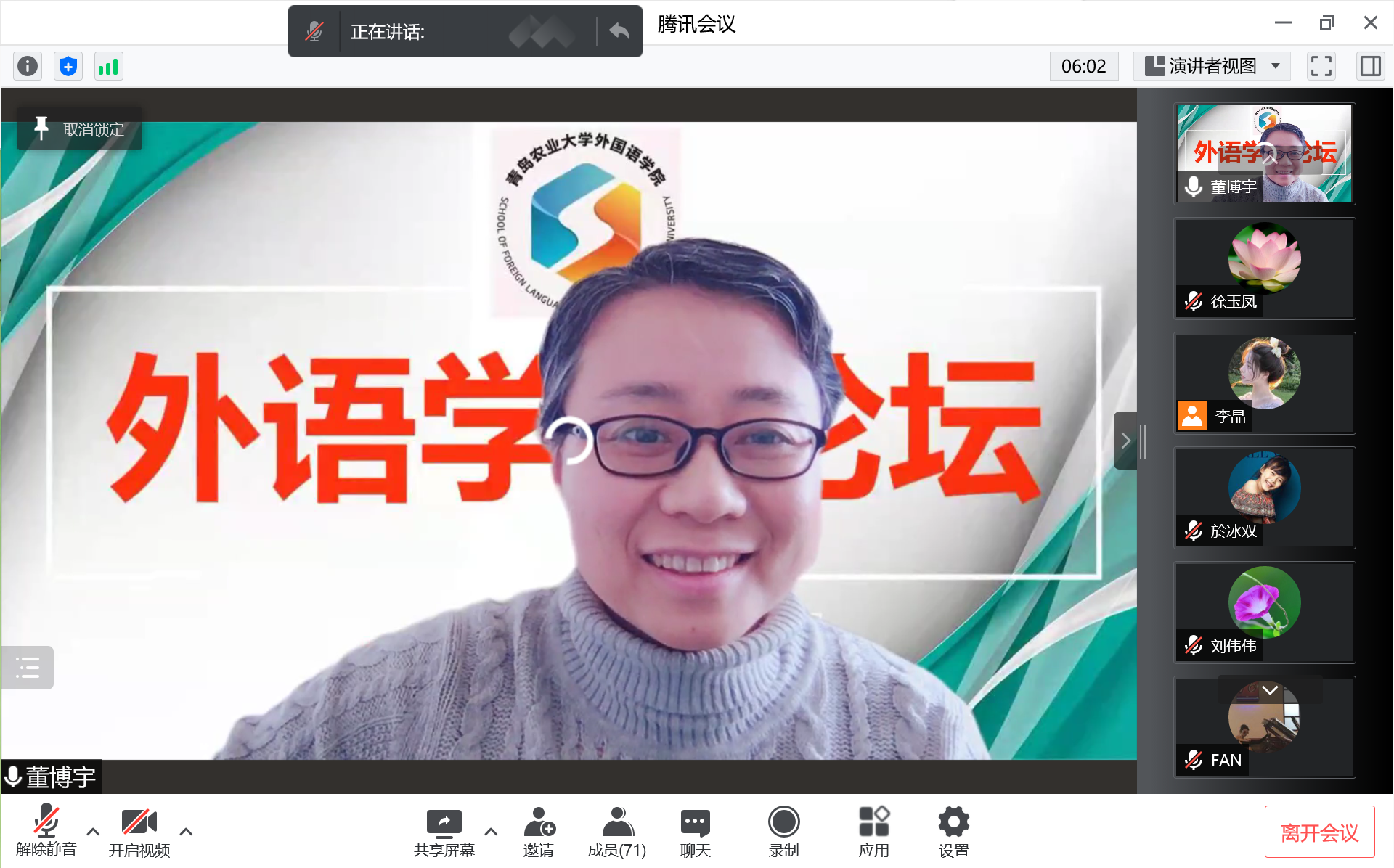 3月31日,太阳集团tyc234cc通过腾讯会议召开线上外语学术论坛第十七讲。此次学术论坛由英语专业二室董博宇博士主讲,题目为《谴责合理化依据的会话分析研究》,学院全体领导、教职工与会,副院长高秀雪教授主持论坛。