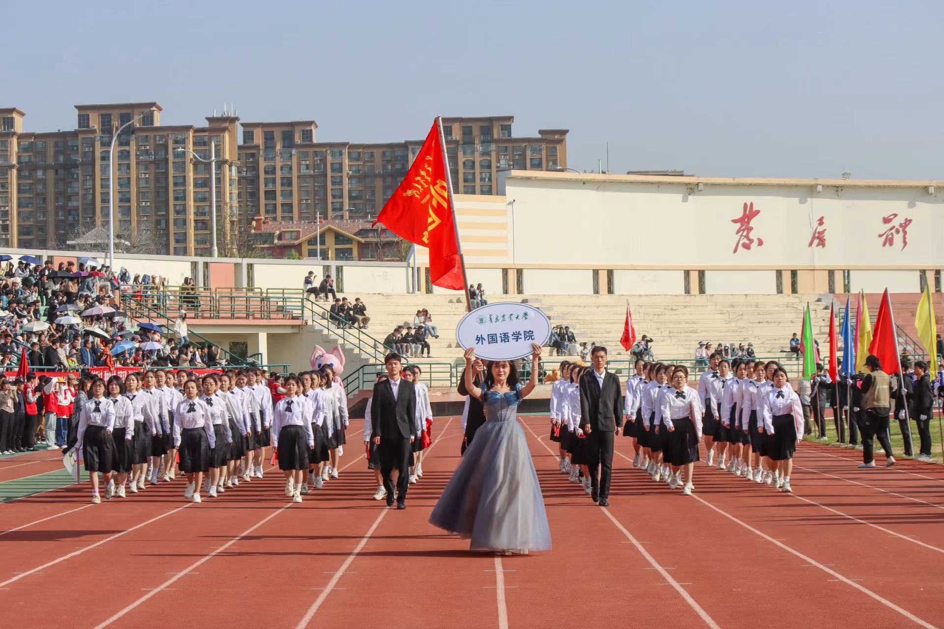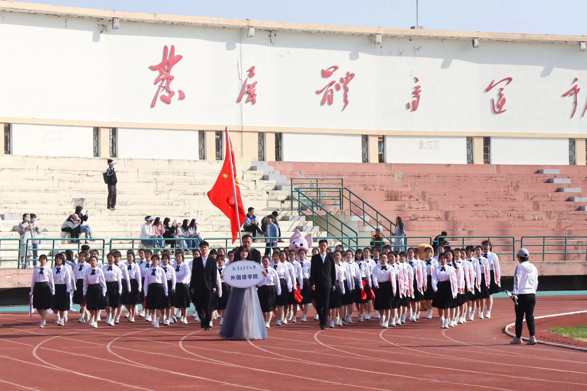 开幕式上,太阳集团tyc234cc学生代表方队迈着铿锵有力的步伐入场,她们嘹亮的口号和自信的笑容生动诠释了外院学子的青春本色。“博外之长,共语辉煌,青春无畏,外语飞扬”的口号彰显了外院学子斗志昂扬的精神风貌,展现了新时代青年的使命与担当。行至主席台前,方队队形变换组成五角星,用六种语言拼写的青春一词,更是外院学子学东西之文,融中外之学,讲好中国故事、传播中国声音的最佳写照。