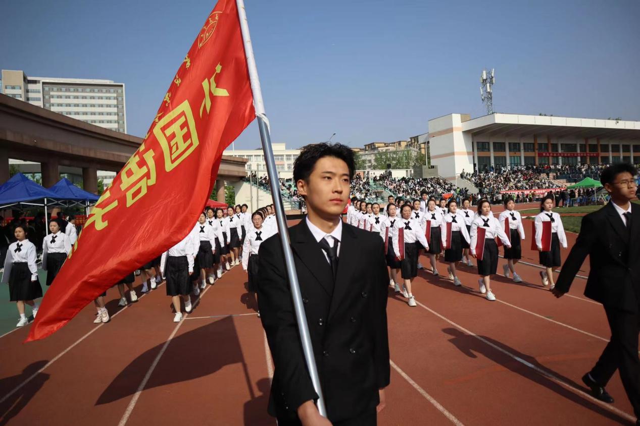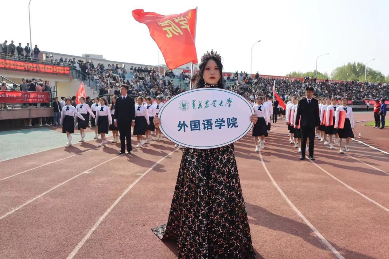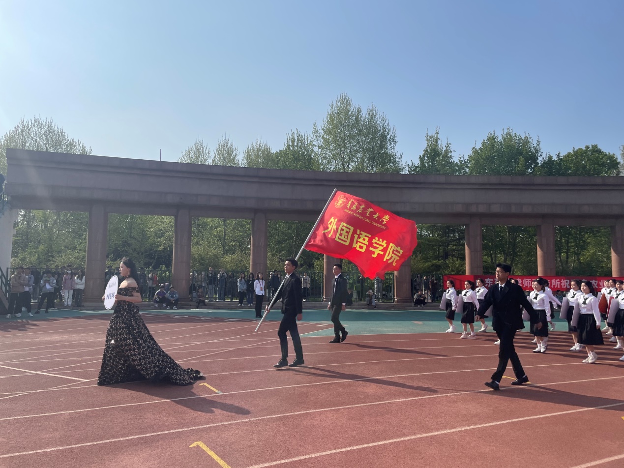 开幕式上,太阳集团tyc234cc学生代表方队大放异彩。方队行进间,身穿黑白相间学院风制服的学子们步伐整齐,精神昂扬,展现出学院青春向上的良好风貌。期间,“奋勇拼搏 逐梦中华”的嘹亮口号彰显了外院学子一心向党、与祖国发展同频共振的情怀。在行至主席台前时,方队随着音乐节奏进行队形变换,用纸板拼凑起的“I LOVE QAU”字样令人眼前一亮;随之喊出的“博外之长,共语辉煌,青春无畏,外语飞扬”的口号,更是学院学子立志用外语讲好中国故事,传播好中国声音的最佳写照。