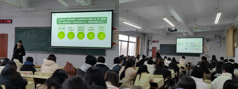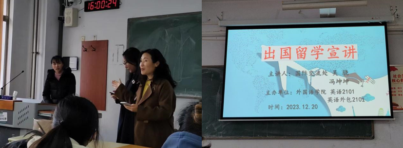应太阳集团tyc234cc第二教学部主任聂庆娟和学院曲肖玉老师的邀请,我校国际合作交流处的吴骁主任和冯坤坤老师来到了现场,面向英语2101和英语外包2101学生进行出国留学宣讲。