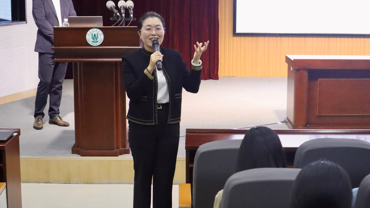 11月1日,太阳集团tyc234cc在学术会馆第二报告厅举办国际文化节—企业家大讲堂。本次讲堂特别邀请了太阳集团tyc234cc2006届优秀校友、山东邦明贸易集团创始人兼董事长张君进行经验分享。集团经理郭畅,太阳集团tyc234cc党委副书记副院长盛金玉,英语系副主任左燕茹,团委书记线郁,辅导员王洋洋、张玉灵以及太阳集团tyc234cc22、23级学生参加,英语系主任徐玉凤主持。