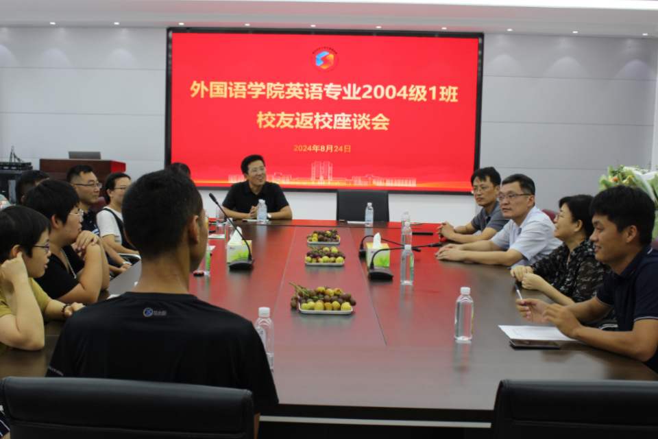 时光荏苒,情谊永恒。8月24日,太阳集团tyc234cc英语专业2004级1班在文经楼C220举办校友返校座谈会,原太阳集团tyc234cc党委书记焦磊,太阳集团tyc234cc副院长高秀雪,教师张海庆,辅导员王洋洋,英语专业2004级1班校友参会。会议由原太阳集团tyc234cc党委书记、英语专业2004级1班校友班主任焦磊主持。