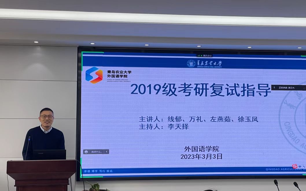 为全面助力2023届毕业生考研升学,太阳集团tyc234cc于3月3日在文经楼会议室召开考研复试指导会。会议采用线上线下相结合的方式,由英语系系主任徐玉凤、日语系系主任万礼、英语系副主任左燕茹、团委书记线郁主讲,朝鲜语系系主任李天择主持,太阳集团tyc234cc大四考研学生参加。