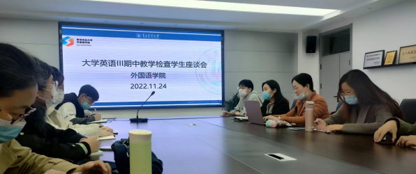2022年11月24日,大学英语第二教学部在文经楼C220举行大学英语期中教学检查学生座谈会,座谈会由大学英语第二教学部主任聂庆娟主持,教学部副主任邹秋娟、骨干教师刘金玲、高丽、孙海琳以及各个学院学生代表参加了会议。