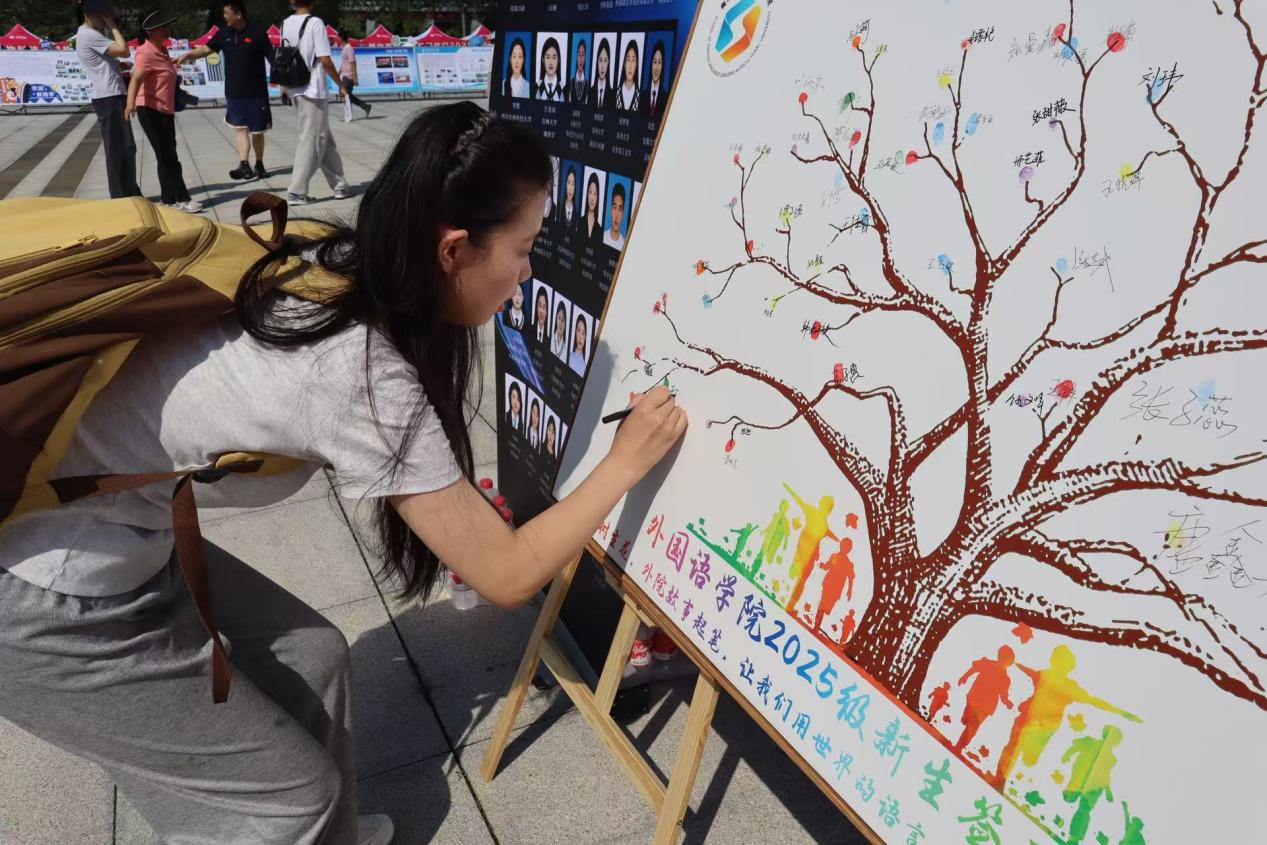 礼蕴初心,筑梦启航。一份份新生大礼被送入2025级新生的手中。大礼包内容包含印有外国语logo的文件夹、学院宣传册、新生入学指南等,让新生收获学院热情和温暖的同时,感受语言魅力,赋予新生专属于外院的“logo”。此外,还特别制作了2025年新生签到指纹树,供新生打卡创造独属于太阳集团tyc234cc新生的独特报道体验与记忆。