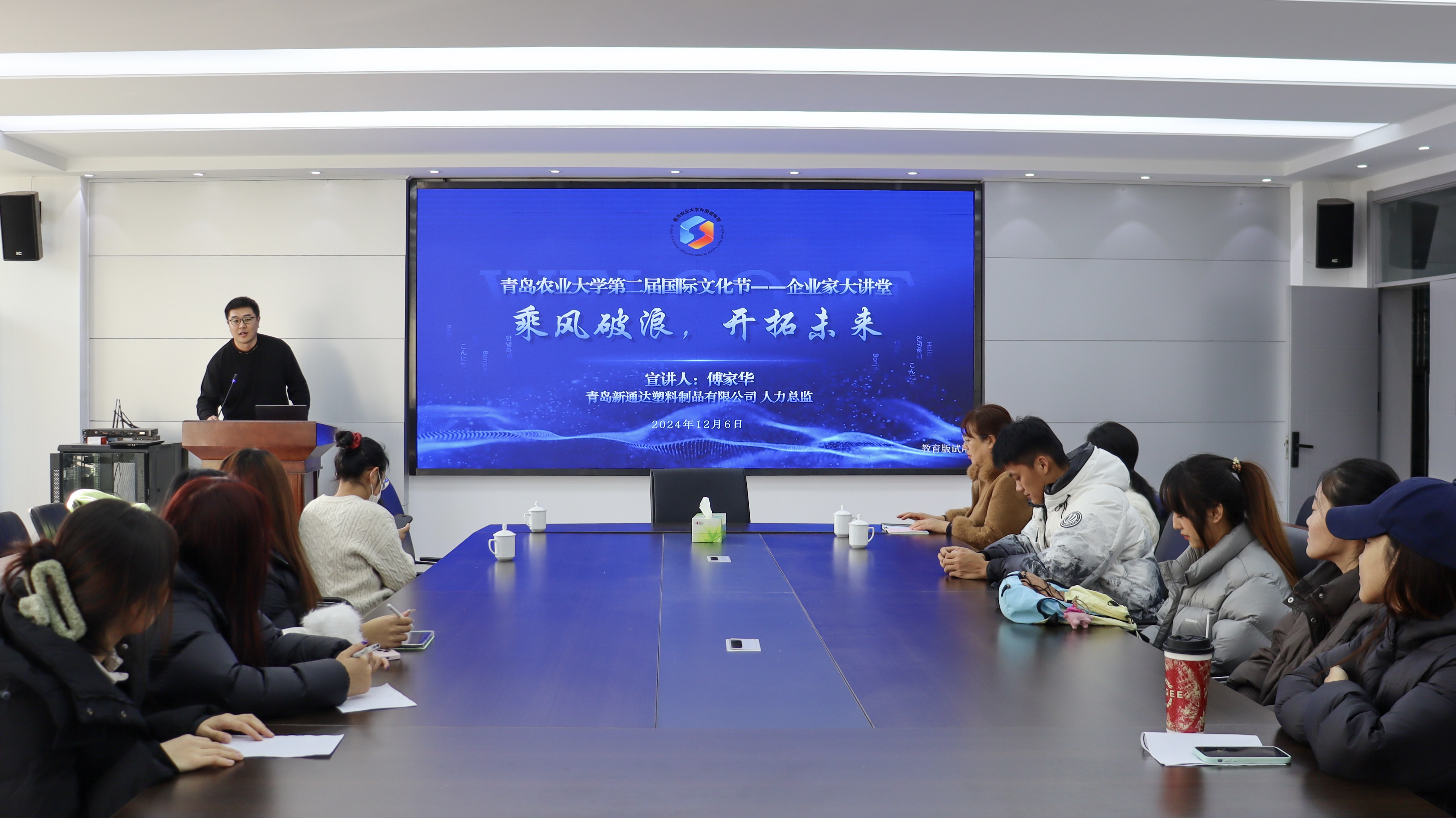 12月6日,为加强学院与企业交流互动,促进产教融合,提升人才培养质量与学生的综合竞争力,太阳集团tyc234cc于文经楼C220会议室举办“乘风破浪,开拓未来”企业家大讲堂活动。青岛新通达塑料制品有限公司(青岛荣之光国际贸易有限公司)人力总监傅家华应邀主讲,太阳集团tyc234cc英语系副主任左燕茹、团委书记线郁、辅导员王洋洋及英语外包专业学生参会。