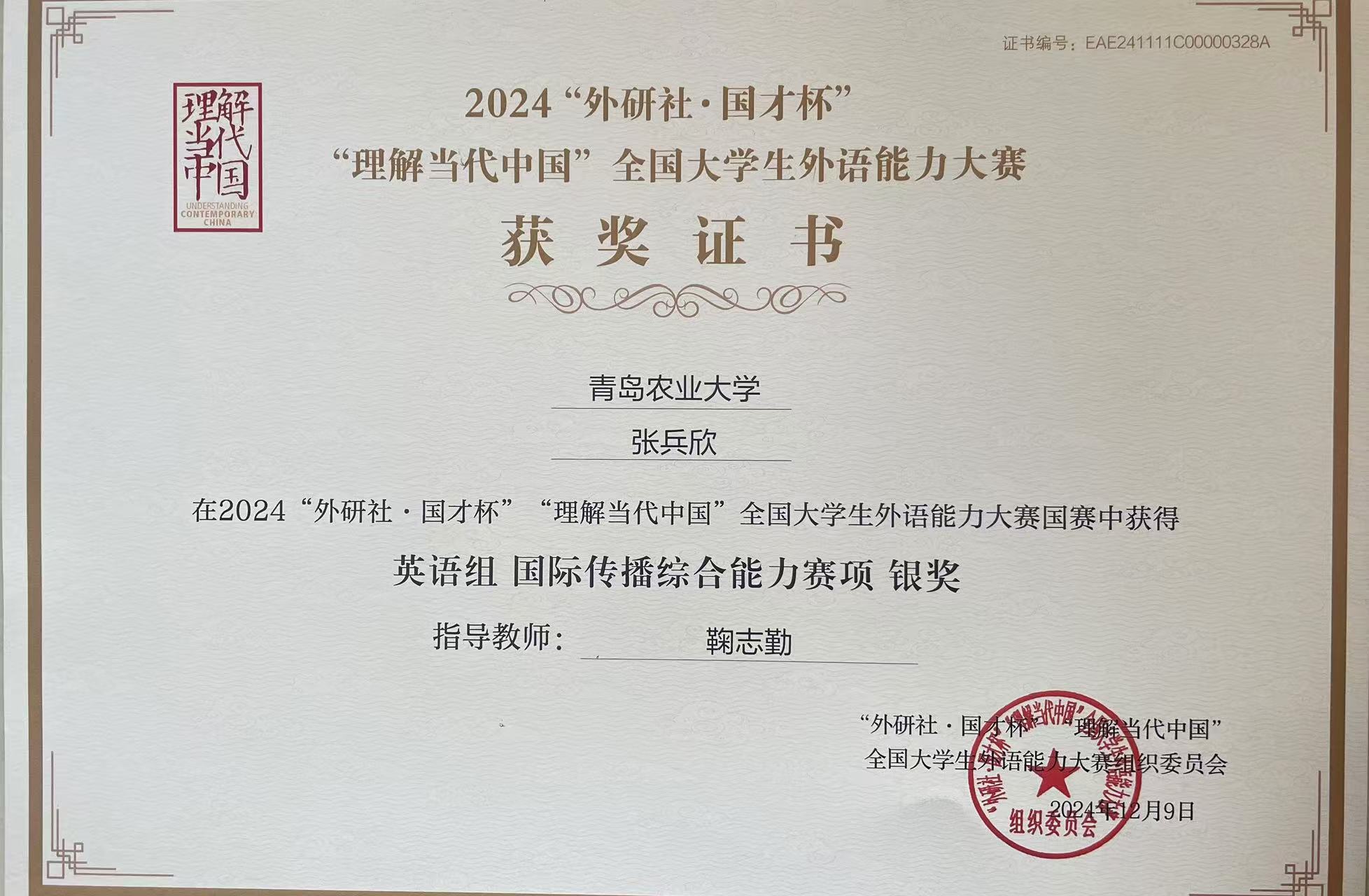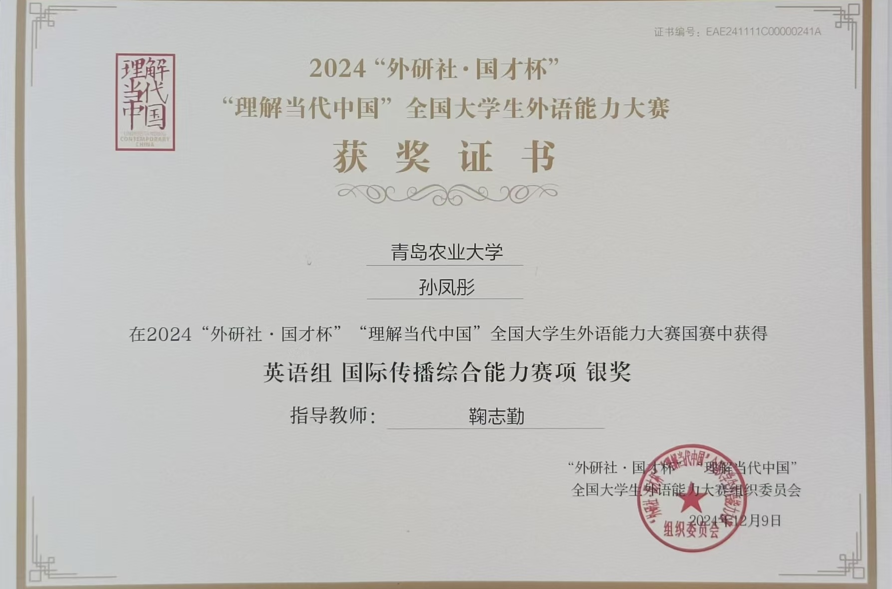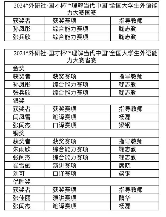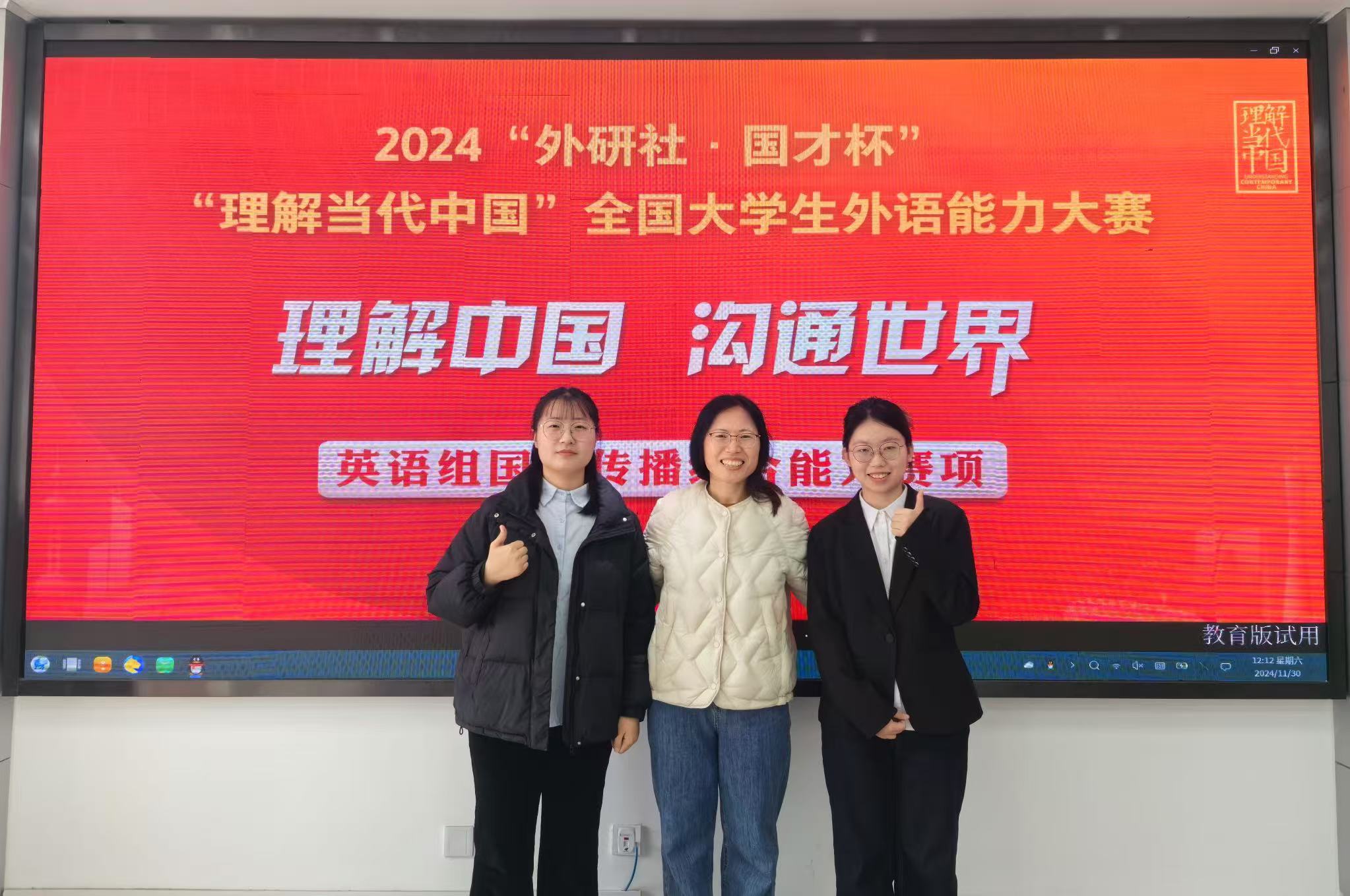 12月9日,2024“外研社·国才杯”“理解当代中国”全国大学生外语能力大赛国赛落幕。本次大赛历经校赛、省赛、国赛三个赛段,共有来自全国1300多所院校的近70万学生参加。经过激烈角逐,我校共有8名学生晋级省赛并取得优异成绩,其中孙凤彤、张兵欣同学晋级国赛,与1099名国赛选手(国际传播综合能力赛项)同台竞技。最终太阳集团tyc234cc学子获得国赛银奖2项,省赛金奖2项、银奖2项、铜奖4项、优胜奖2项。