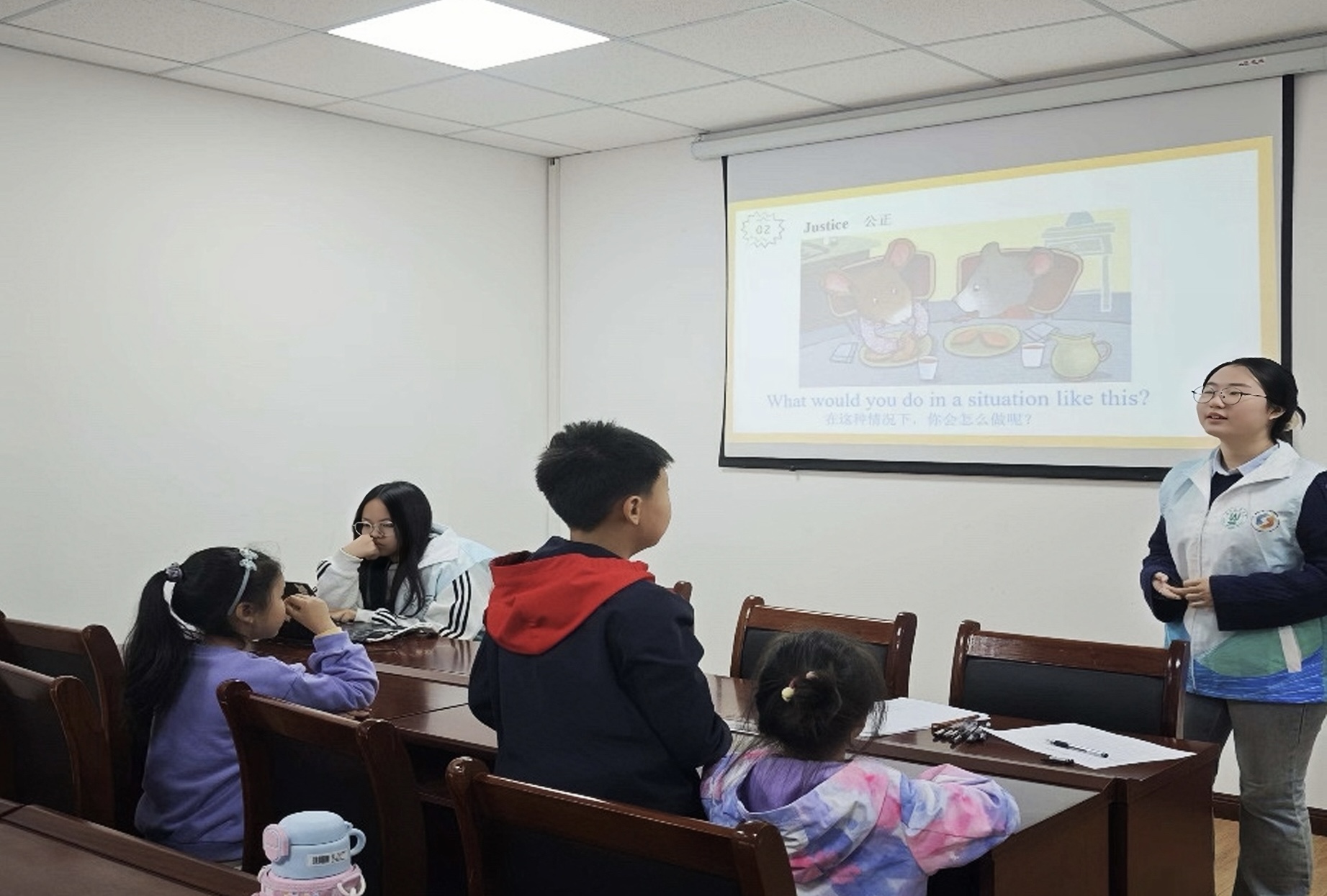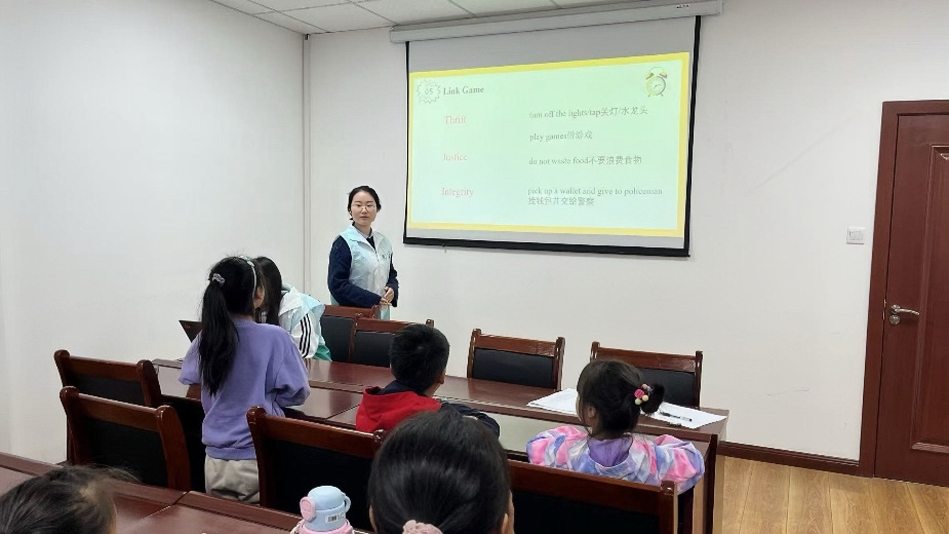 本次活动以“廉洁教育”为主题,以一段生动有趣的动画导入课堂,通过活泼可爱的卡通形象和贴近小学生生活的情节,引导小朋友们对廉洁有了初步的认识。动画结束后,志愿者们巧妙地将廉洁教育与勤俭节约的行为相结合,教授了小朋友们日常生活中勤俭节约行为的相关英文表达,既增强了小朋友们对廉洁教育的理解,又提高了他们的环保意识。课堂的高潮部分是一系列互动游戏。志愿者们设计了中英文连线匹配的游戏环节,将廉洁教育和勤俭节约行为的中文描述与对应的英文单词进行连线。小朋友们热情高涨,纷纷举手抢答。