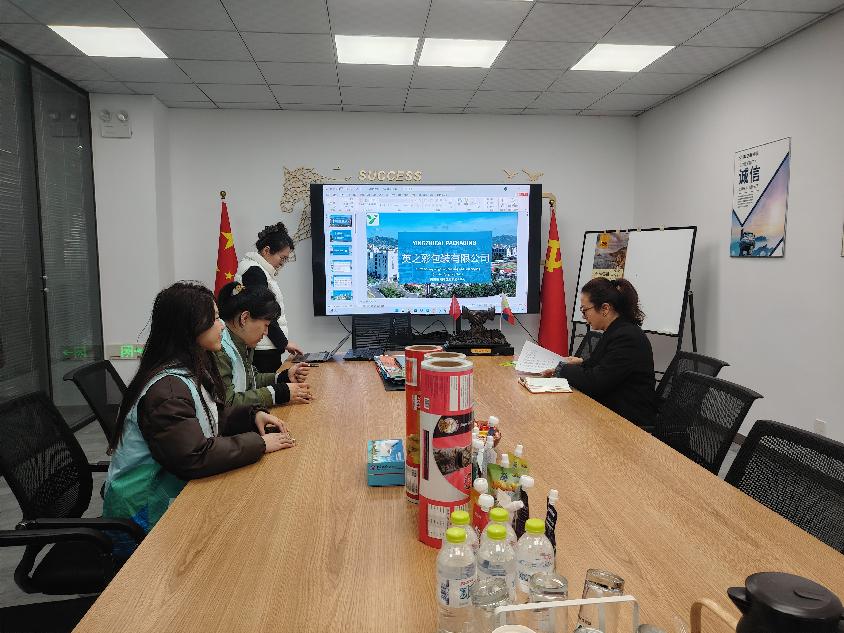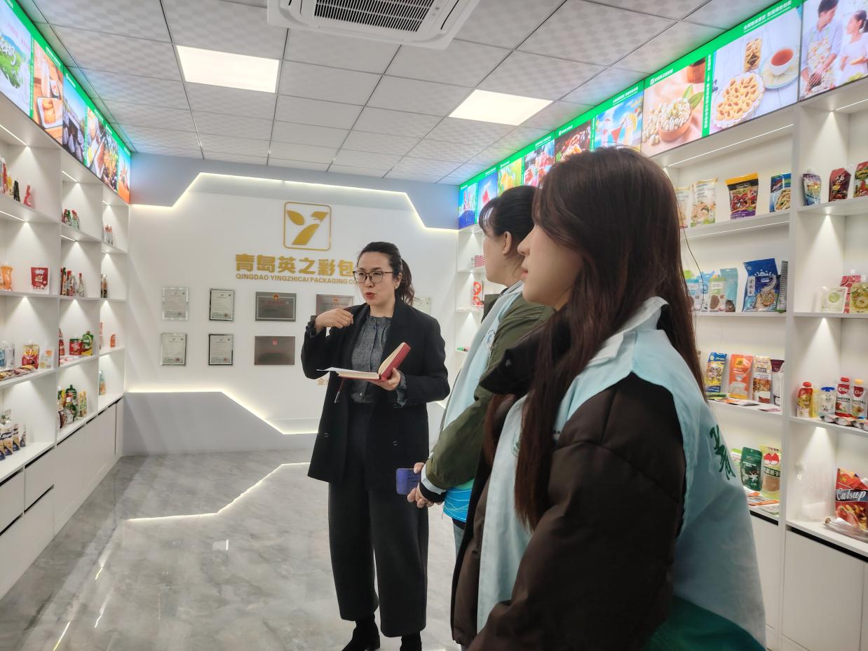 在参观青岛英之彩包装有限公司的过程中,团队一行在会议室观看了企业制作的外语宣传片,详细了解了公司的运营模式、岗位需求及人才培养方式。随后,团队成员参观了公司专门设立的产品样品间,其中包括众多国内外知名品牌,如亨氏、雕牌、巧媳妇等。团队成员切身感受了企业在包装设计、生产及创新方面的成果。企业负责人详细介绍了公司的发展历程、技术创新及人才需求情况,并与学院团队就教学与实践融合、校企合作等方面进行了深入探讨。负责人还详细介绍了公司的发展前景、岗位需求及职业发展路径,并耐心解答了学生们关于就业申请和职业发展的疑问,提供了宝贵的建议和指导。