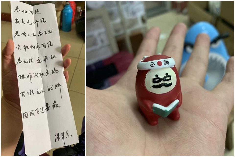 孙瀚彬是日语1502班22名同学中“仅有的”4名男生中的一员,担任班级宣传委员。他为全班每一位同学准备的礼物,都放在亲笔书写同学姓名的信封中,信封内有同学们喜欢的挂件、漫画、书法书签和校园风景明信片。“正好自己也会画画和书法嘛,所以就做了这些小东西”,在被问到为什么想到送礼物这个问题时,孙瀚彬说道,“我觉得‘毕业’二字在六月显得挺沉重的,想起大家四年一千多天的朝夕相处,这时候感觉非常珍贵。相遇都是有意义的,有些人可能毕业后再也不容易见到了,所以我觉得这些微不足道,相遇真的是很美好的事。”